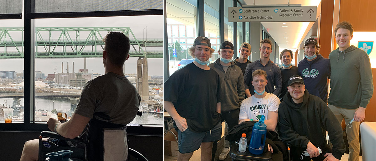 Jack at Spaulding (left), Jack being visited by Endicott hockey teammates (right)