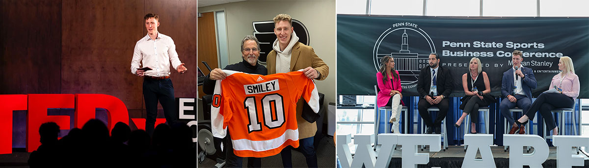 Jack co-hosting the 2024 Endicott Tedx event (left), Jack meeting John Tortorella (middle), Jack speaking at the Penn state Sports Business Conference (right)